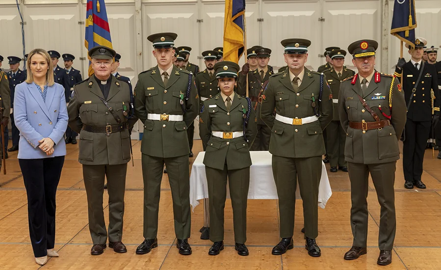 On 12 Feb 2026, the Minister for Defence, Ms Helen McEntee TD, accompanied by the COS Lieut Gen Rossa Mulcahy, presented Distinguished Service Medals to Cpl Daniel Padden, Pte Dylan Geraghty, Pte Ciara Shanahan and Father Paul Murphy CF at Dún Uí Mhaoilíosa. On 15 Aug 2024,as Fr Paul Murphy was returning to barracks in his vehicle. He was attacked and seriously injured outside the gates of the Bks by an assailant armed with a knife. Pte Ciara Shanahan, who was unarmed was on gate duty, proceeded to attempt to deter the attacker. The Guard Commander, Cpl Daniel Padden accompanied by another member of the Barrack Guard, Pte Dylan Geraghty responded rapidly, warning shots were fired, after which Pte Geraghty tackled the assailant and removed the threat from Fr Murphy.
