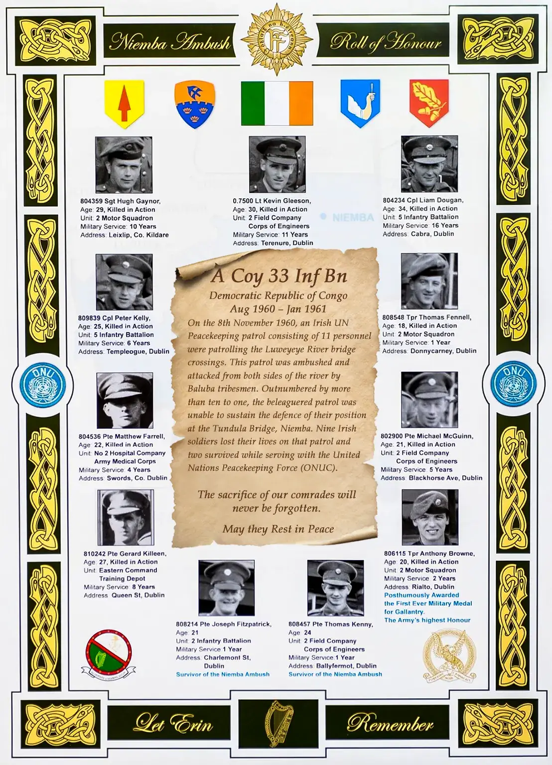 The bodies were escorted from the Congo to Dublin by Capt Donald Crowley (2 IC A Coy), Cpl Michael Colton (DOD Coy) [President of Post 1], Cpl P Anderson (7 Inf Bn), Pte James Kennedy (2 Inf Bn), Tpr Patrick Feeney (2 Mot Sqn) and Pte Peter Donnelly (2 Fd Engr Coy).