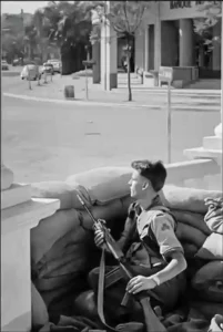 At 1600 hours on 14 Sep, Lieutenant Tom Ryan, (Platoon Commander 1 Platoon) was guarding the Radio College with one Sergeant, two Corporals and Seven Privates, they had one Bren Light Machine Gun. He was approached by a French mercenary in civilian attire along with a priest. They knew the strength of the Irish guard at the Radio College was eleven and they had details of their weapons. The showed him one Gendarmerie armoured car and a jeep on the street with a recoilless rifle covering the college, at a signal from the mercenary, armed whites in civilian attire and uniformed Gendarmerie appeared from firing positions in the surrounding buildings. Lt Ryan was forced to surrender in the face of overwhelming opposition. The eleven C Company personnel were the first 35 Battalion personnel to be captured by the Gendarmerie and held as hostages.
